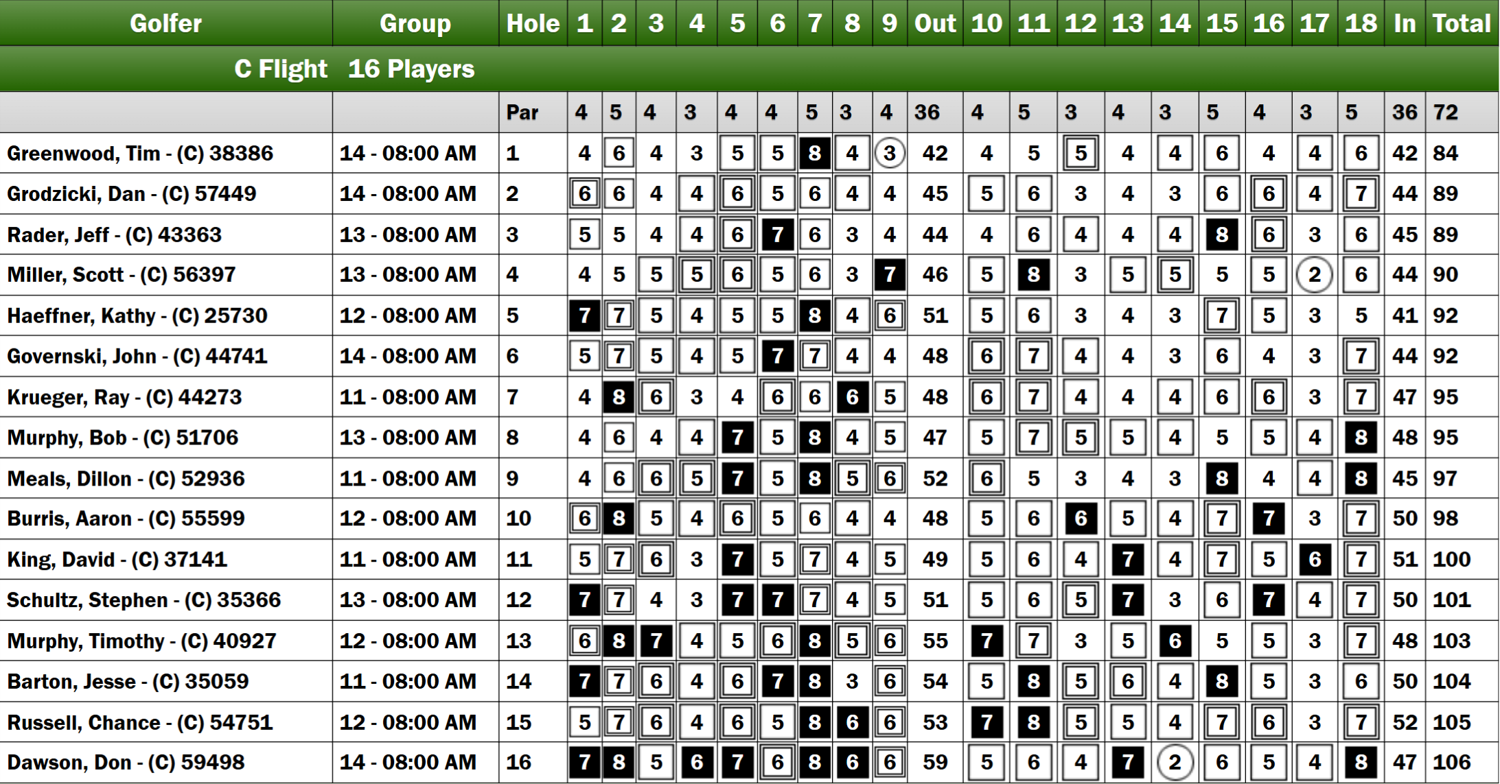 The D Flight commenced with Cliff Austin Jr. achieving a birdie on his opening hole. Brad Haeffner followed suit, securing a birdie on the second hole and ultimately leading the front line with a score of 40. He was closely followed by Mark Fuqua, who finished with a score of 43, and Austin Jr., who recorded a 44. Haeffner maintained his lead by scoring a 45 on the back nine, with Fuqua securing second place and Austin Jr. finishing in third.