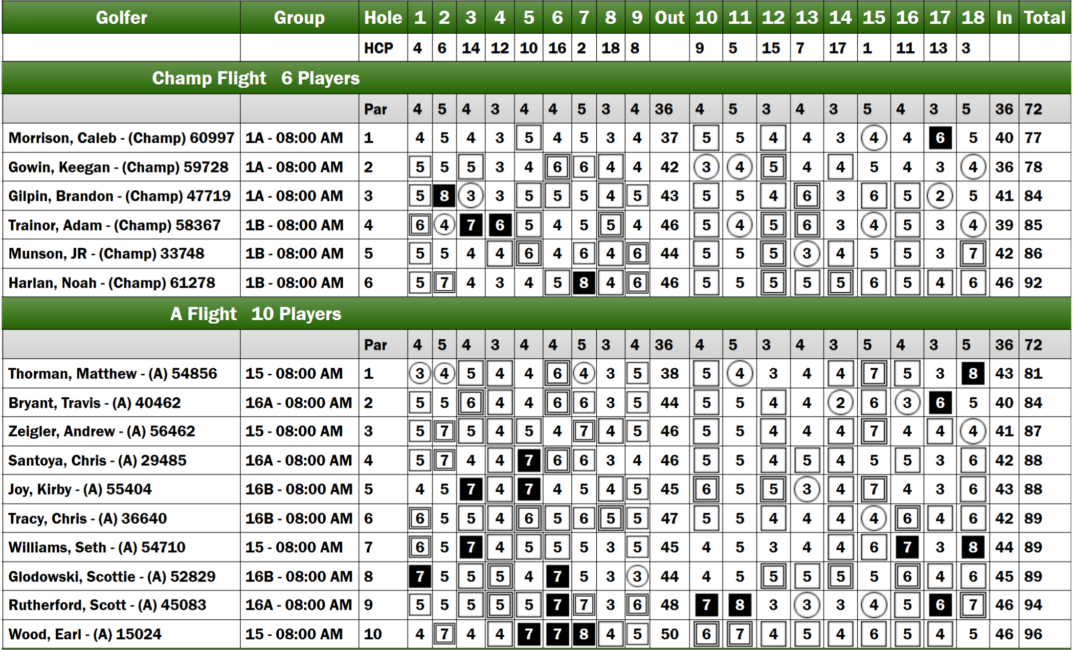 The A Flight featured ten competitors, with Kirby Joy and Andrew Zeigler initially performing well, both at +1 after four holes. Travis Bryant, Chris Santoya, and Earl Wood were two shots behind at +3. However, the challenging course created fluctuations in the leaderboard. After ten holes, Matt Thorman recorded two birdies, elevating his score to +5, while Zeigler’s score increased to +7 and Joy's to +8. In the final six holes, Bryant made a notable comeback with a score of +2, but Thorman matched his performance, also finishing at +2. Ultimately, Thorman secured victory by three strokes over Bryant, with Zeigler claiming third place.