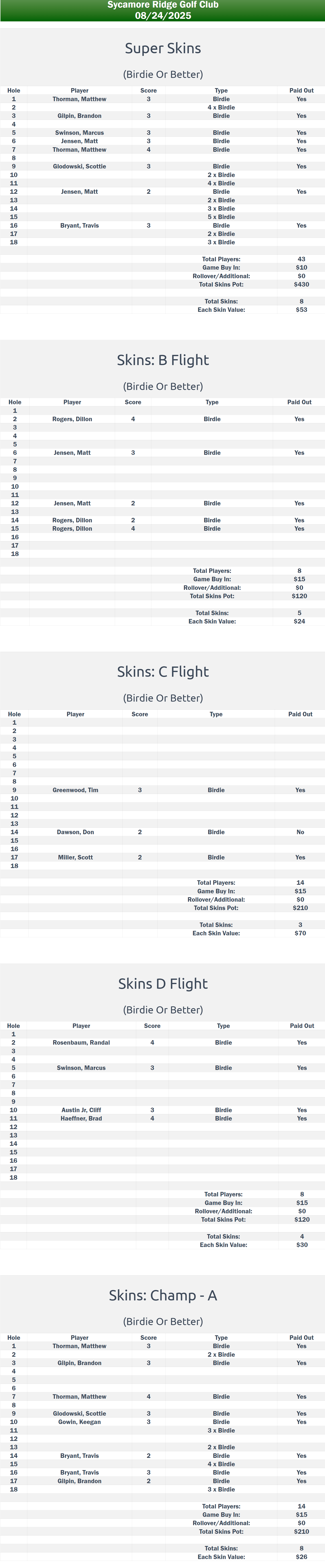 Our tournament at Sycamore Ridge Golf Course featured the most favorable weather conditions we have experienced to date. Additionally, the participation of six Champ Flight players was a notable enhancement to the event. Caleb Morrison emerged as the leader after nine holes, posting a score of +1 and enjoying a five-stroke advantage over Keegan Gowin. Keegan commenced the back nine with consecutive birdies on holes ten and eleven, narrowing the deficit to two strokes. He secured another birdie on hole 18, ultimately finishing just one stroke behind as Morrison claimed yet another victory.