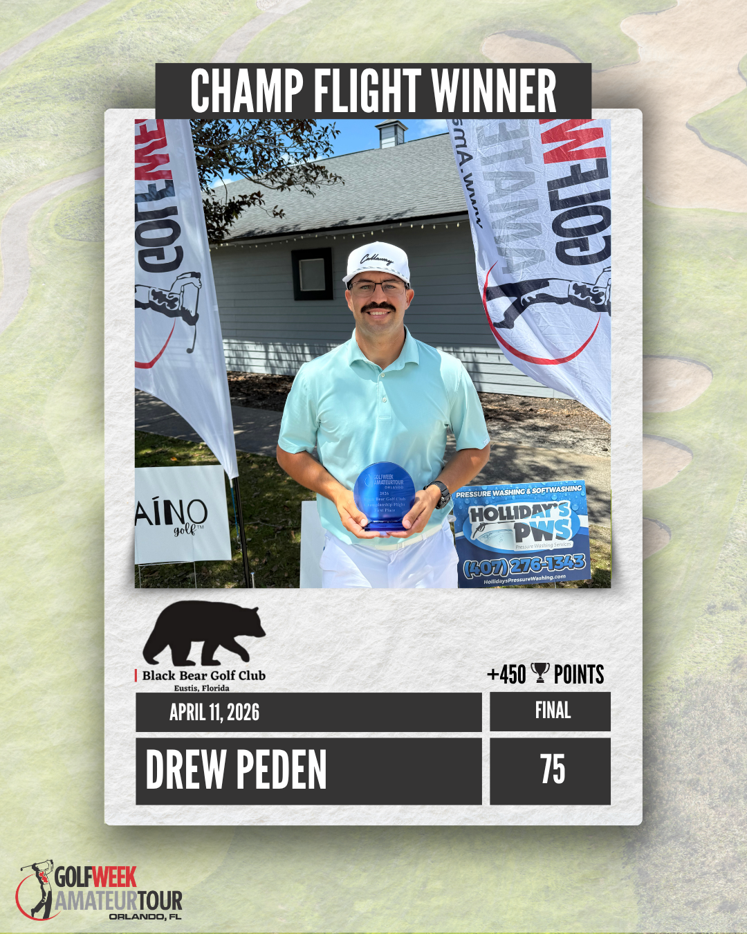 The weather was beautiful on Saturday at Black Bear Golf Club where new Tour member Drew Peden won his first Orlando tournament in the Champ Flight Division firing a 3 over par 75. Abe, Shawn, and Scott all won their first tournament of the season while Craig got his second victory of the season and has added to his lead in the Season 1 competition. Our 2-day major at Mt. Dora is this weekend, so get signed up soon!