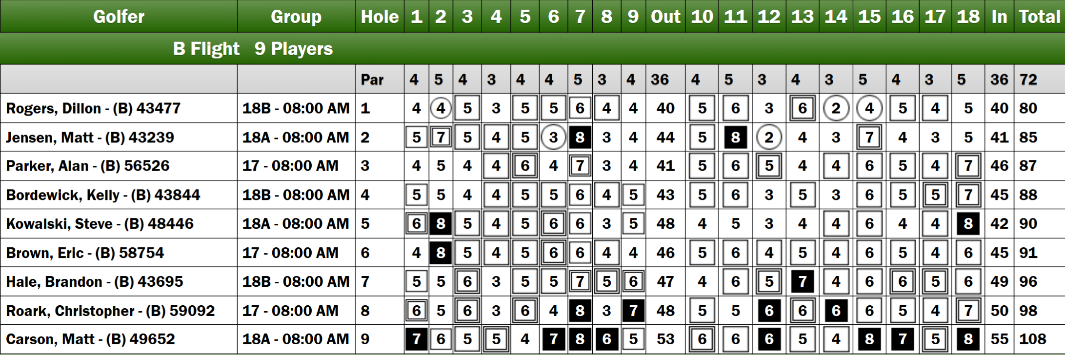 The B Flight showcased Dillon Rogers, who began with a strong performance, securing a birdie on his third hole and maintaining his lead through the first eight holes. At +3, Rogers held a two-stroke advantage over Alan Parker, while Matt Jensen, Kelly Bordewick, and Brandon Hale trailed at +7. After twelve holes, Rogers expanded his lead to four strokes over Parker, with Jensen six strokes behind, striving to position himself within the prize money. Ultimately, Rogers concluded the tournament with two birdies in the final stretch, finishing at +8. Jensen also performed well, completing the last six holes at +1 to secure second place.