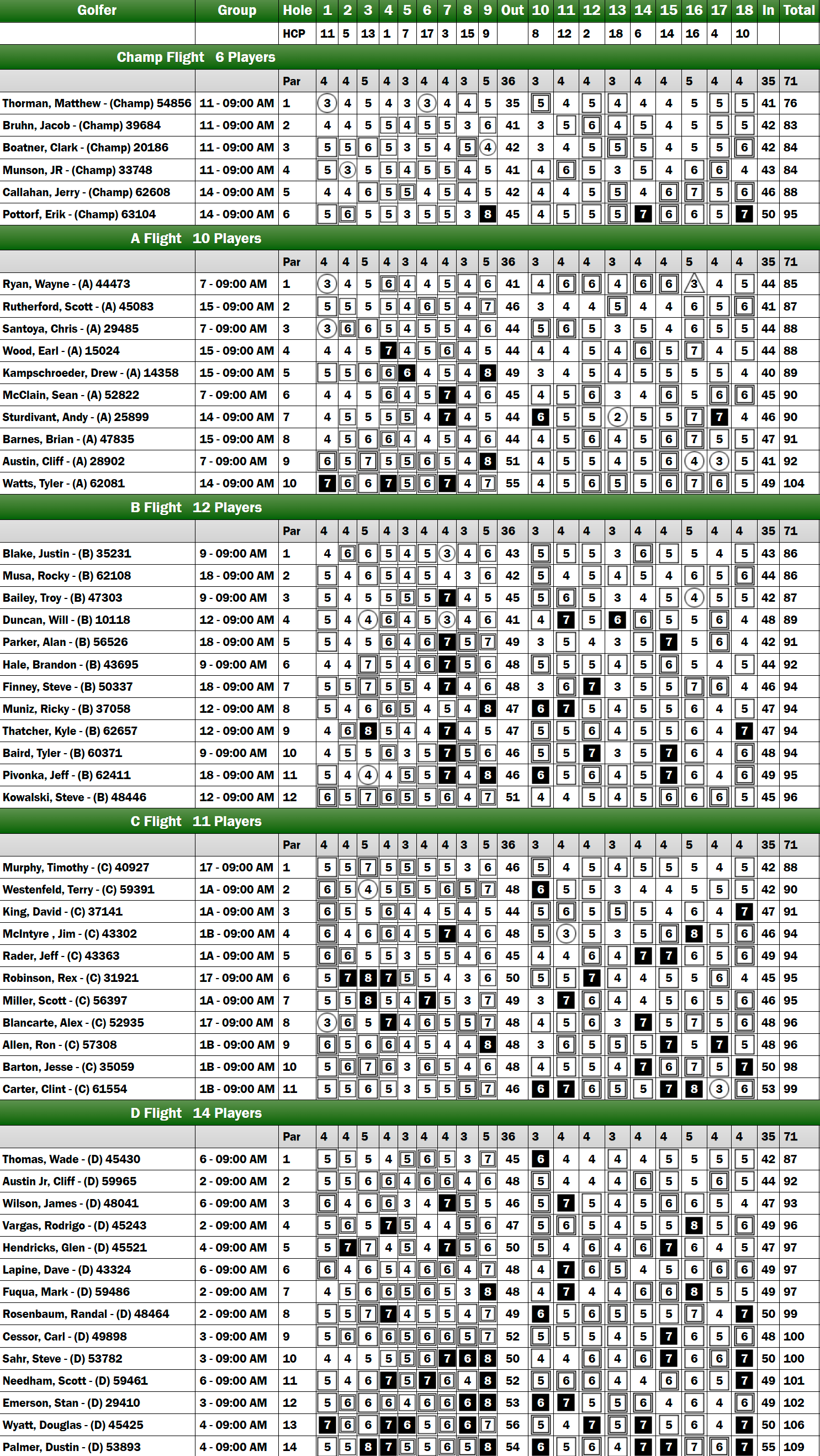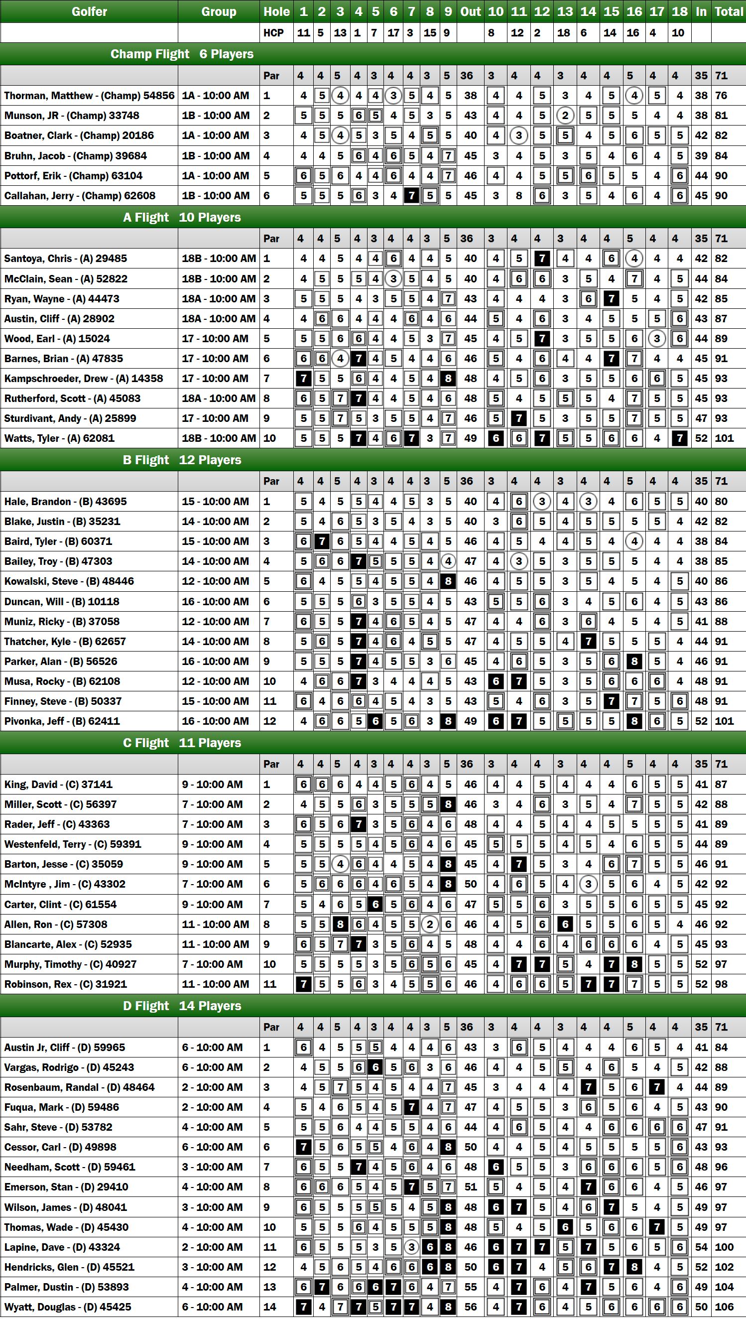 Entering the final six holes, Austin Jr. still held a commanding six-shot lead over Vargas and claimed victory and promotion to C Flight. However, Thomas Wade from the Arkansas Tour made a late charge, finishing strong to tie Vargas for second place, while Fuqua secured fourth.