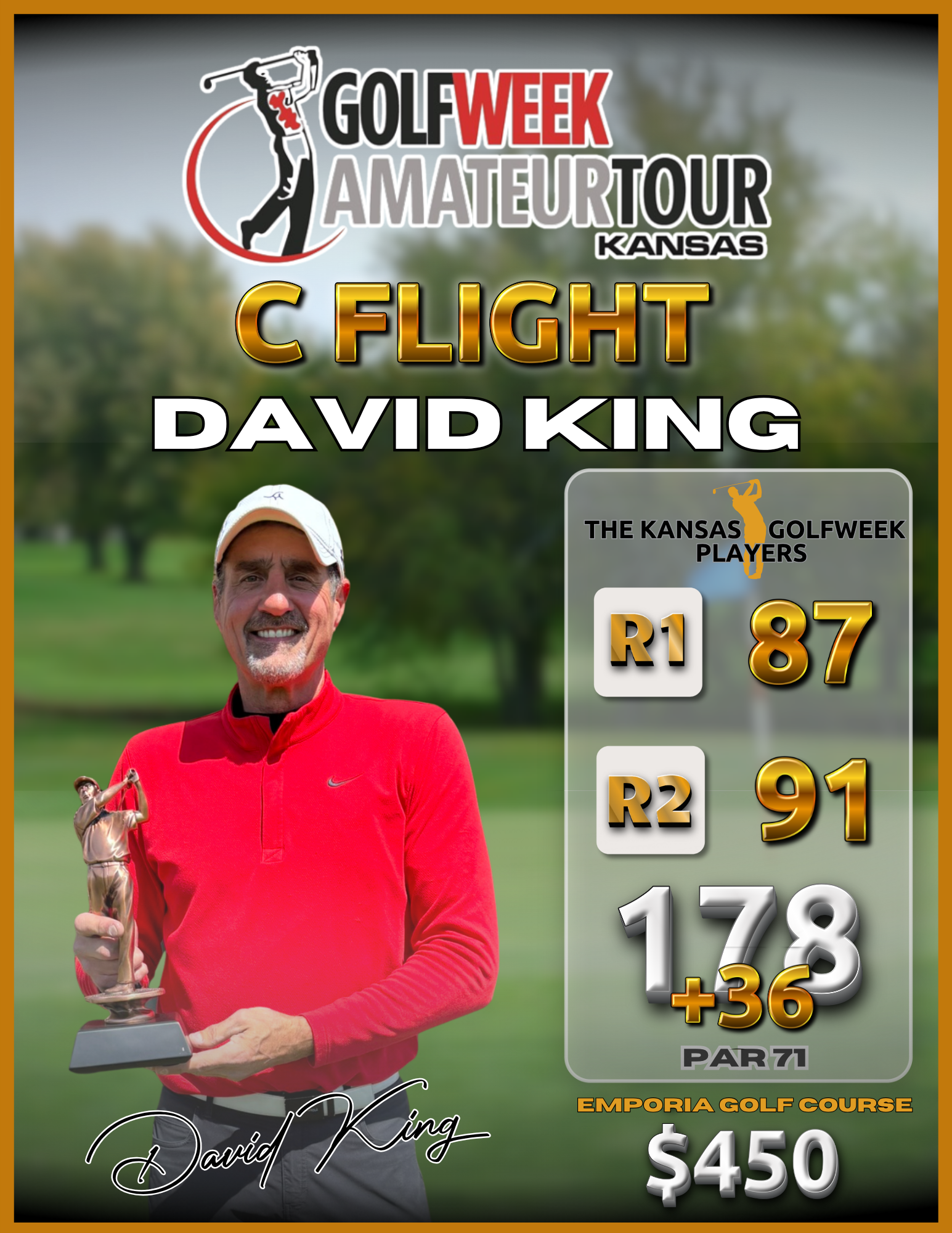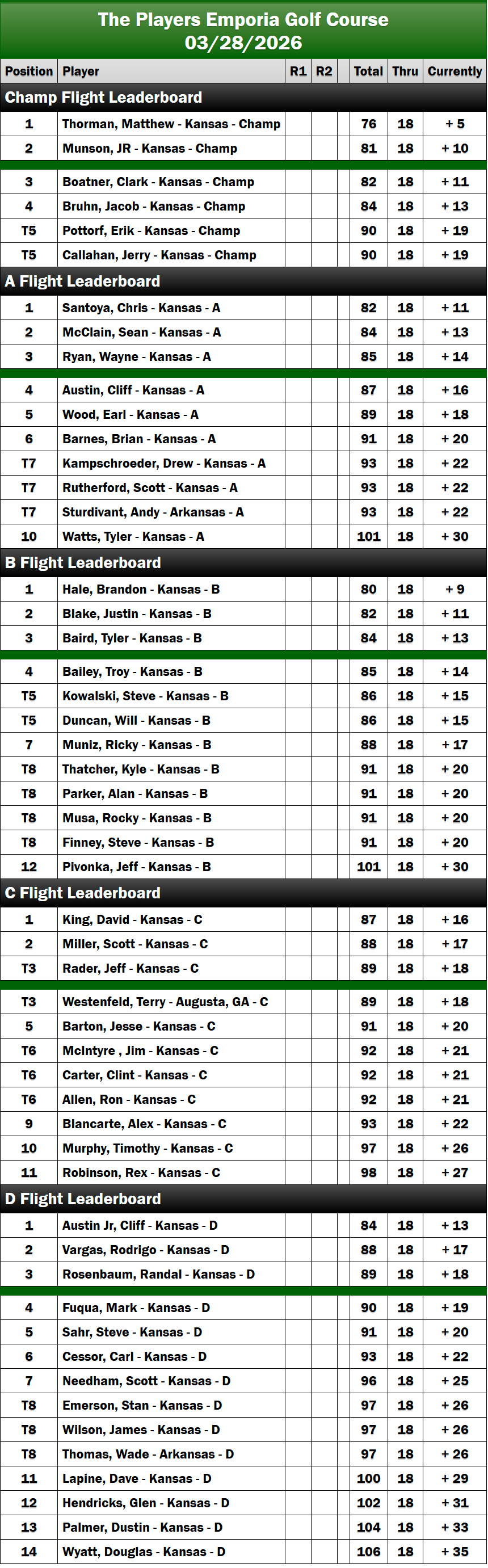 The 2026 Kansas Golfweek Players Championship at Emporia Golf Course proved to be a true test of skill, patience, and resilience under challenging conditions. From start to finish, competitors battled the elements and each other, producing exciting finishes across every flight. Congratulations to all our flight winners and participants for an outstanding kickoff to the season. We look forward to building on this momentum as the Kansas Tour continues throughout 2026.