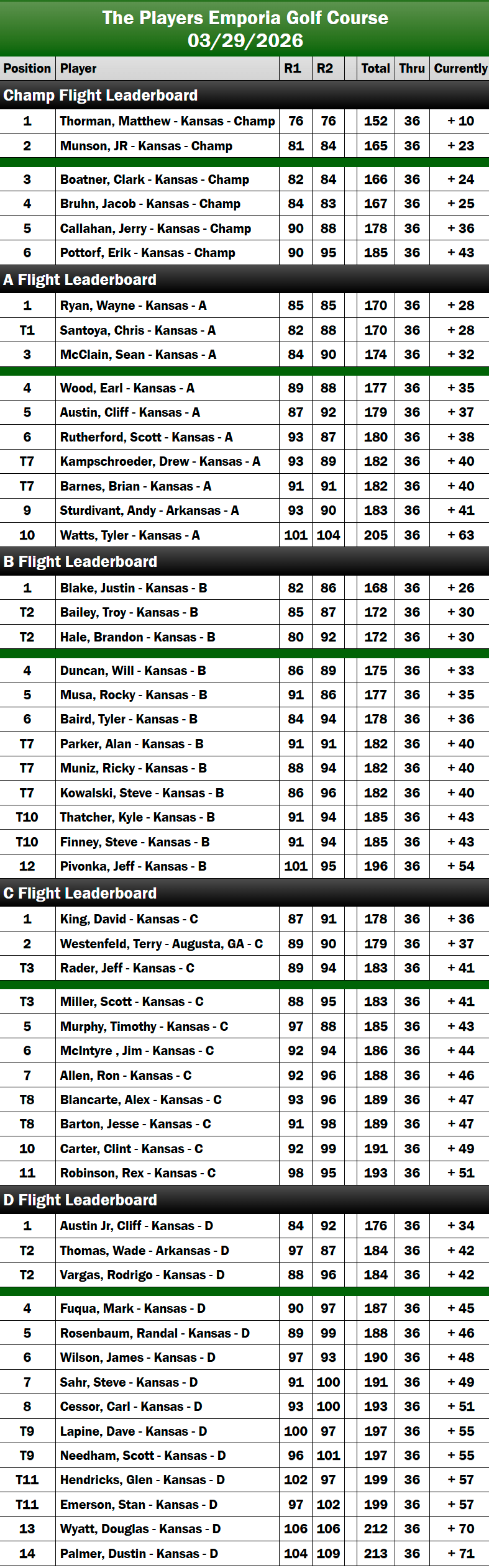 In the Championship Flight, early contenders included Jacob Bruhn at even par and Clark Boatner at +1, with J.R. Munson, Matthew Thorman, and Jerry Callahan close behind. By the end of day one, Thorman emerged as the leader, holding a narrow advantage over Munson. Through 27 holes, Thorman extended his lead by claiming back-to-back wins at The Kansas Golfweek Players Tournament with a +10, while Munson maintained his position in second, fending off strong pressure from Boatner and Bruhn.