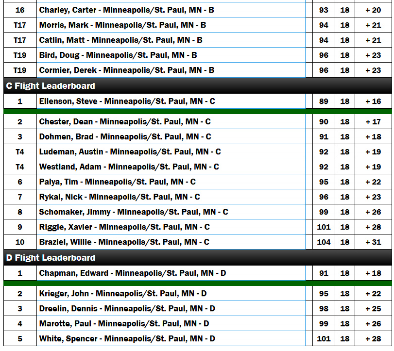 Consistency paid off for Steve Ellenson, who captured the win with an 89 (+16). Dean Chester (90, +17) and Brad Dohmen (91, +18) rounded out the top three in another closely contested flight.