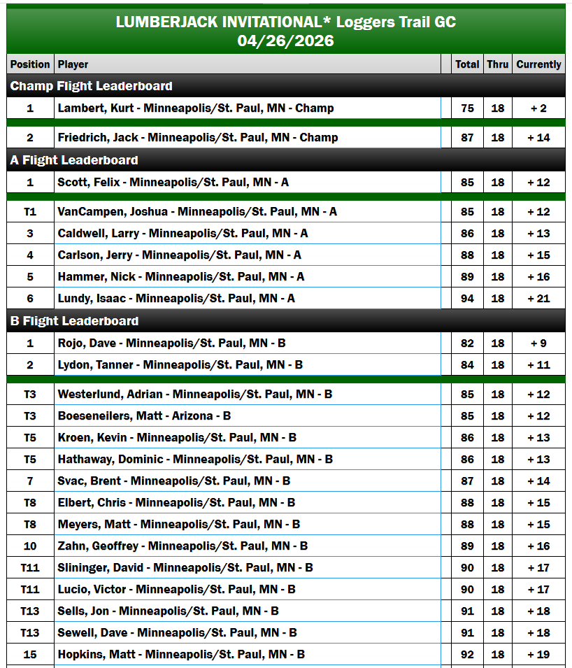 The Lumberjack Invitational delivered a full day of competitive golf at Loggers Trail, with players across all flights battling tough conditions and a demanding layout. From steady championship play to tightly contested finishes in the flights, the event showcased exactly what the Minneapolis–St. Paul Golfweek Amateur Tour is all about.
