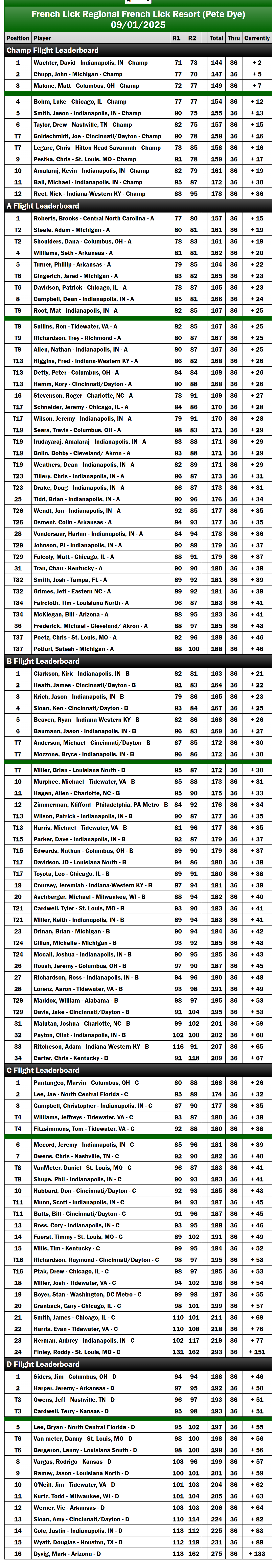 David Wachter from Indianapolis, IN, triumphed in the Champ Flight with an impressive final score of 144, finishing at +2 over two days. He began his campaign on a strong note, recording a 71 on the Ross Course, which provided him with a comfortable lead heading into the notoriously challenging Dye Course. His second-round score of 73 demonstrated his ability to maintain consistent performance under pressure.