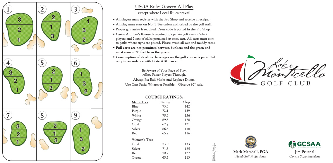 - Par 3s at Lake Monticello if the ball is hit into the hazard, you may elect to use the ladies RED tee as a drop zone or Forward Tee.